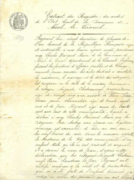 | Aujourd’hui vingt deuxième de pluviose de l'an second de la République Française une et indivisible à une heure après midi pardevant moy Charles Barraud Maire de la Commune de Nieul-le-Virouil département de la Charente-Inférieure, faisant les fonctions d’officier public et de Charge vacante pour recevoir les actes destinés à constater la naissance, le mariage et le décès des citoyens, Est comparu en la salle de la maison Commune le citoyen Auguste Chateauneuf propriétaire âgé de vingt-cinq ans, assisté de Pierre Lan- dreau jeune thonnelier âgé de trente-sept ans et de Jean Peyront âgé aussi de trente sept ans, tous de cette municipalité, lequel a déclaré à moy Charles Barraud Maire que la citoyenne Rose Aubry son épouse en légitime mariage est accouchée de hier au soir sur les neuf heures du soir dans la maison appelée la Mestairie de la Foy, dite municipalité, d’un enfant Mâle qu’ils m’ont présenté et auquel il a donné le nom de Jean, d’après cette déclaration que les citoyens Auguste Chateau neuf, Pierre Landreau et Jean Peyront ont certifié conforme à la vérité et la présentation qui m’a été faite de l’enfant dénommé j’ai rédigé en vertu des pouvoirs qui me sont délégués |