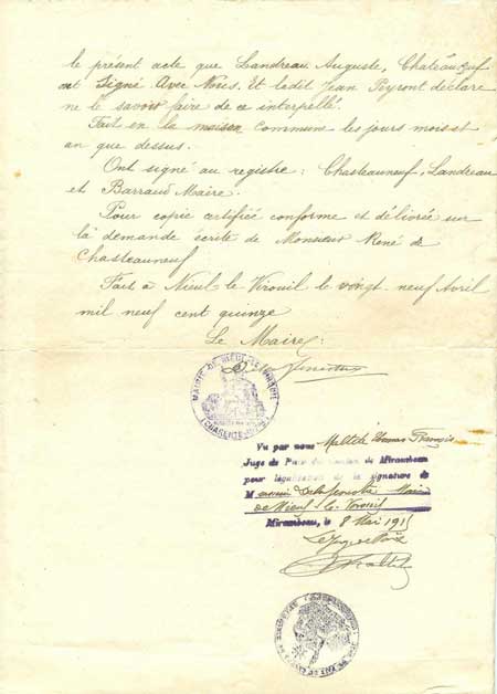 Pour copie certifiée conforme et délivrée sur la demande écrite de Monsieur René de Chasteauneuf. Fait à Nieul-le-Virouil le vingt-neuf avril mil neuf cent quinze Le Maire : Signature Delafenestre