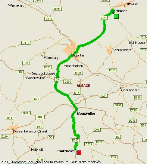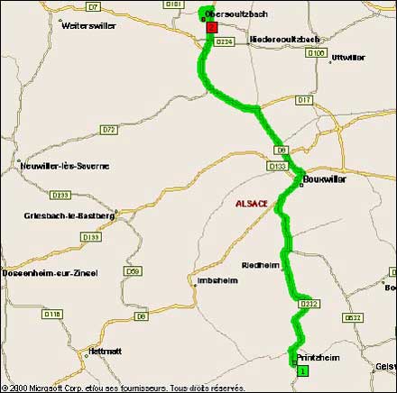 25 mars – 1er avril 1940 : Printzheim (Bas Rhin) Le 25 mars, nous partons à pied (18 km) de Rothbach pour Printzheim (Bas Rhin - Arrondissement de Saverne). Nous marchons pendant 18 heures avec tout le barda et les munitions. Le sac est lourd. Beaucoup ne peuvent arriver au bout, et les camions ramassent les traînards et les boiteux. | ![]() |