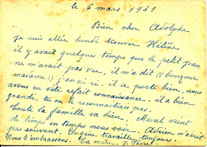 Lettre de Justine FAVRE à son fils Claudius, Adolphe FAVRE - 6 mars 1941 à Saint Thilbaud de Couz (73160 Savoie)