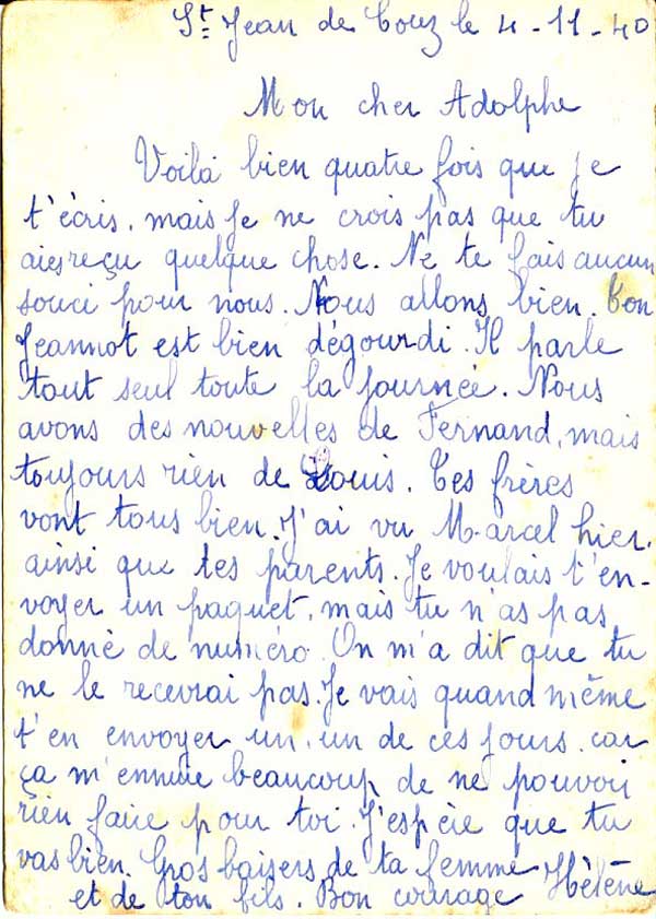 Lettre de Hélène FAVRE à son époux Claudius, Adolphe - 4 novembre 1940 à Saint Jean de Couz (73160 Savoie)