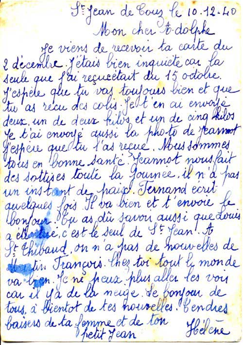 Lettre de Hélène FAVRE à son époux Claudius, Adolphe - 10 décembre 1940 à Saint Jean de Couz (73160 Savoie)