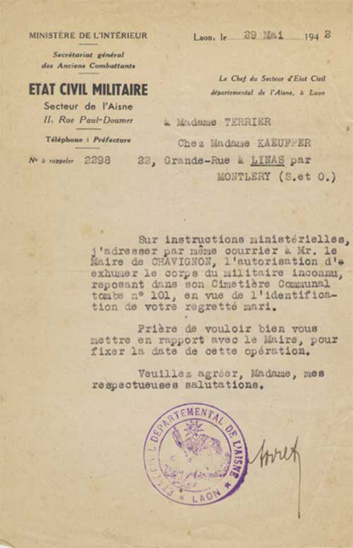 Sur instructions ministérielles, j'adresser par même courrier à Mr. le Maire de CHAVIGNON, l'autorisation d' d'exhumer le corps du militaire inconnu, reposant dans son Cimetière Communal tombe N° 101, en vue de l'identifica- -tion de votre regretté mari.