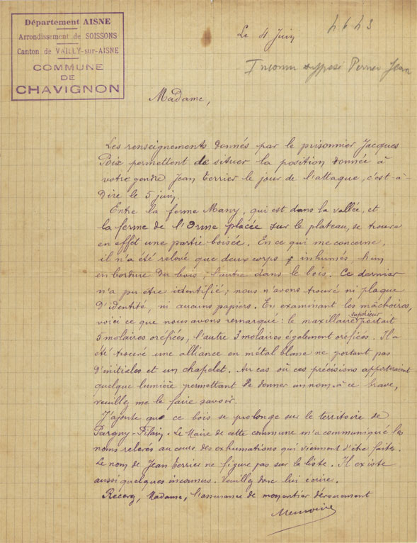 Les renseignements donnés par le prisonnier Jacques Poix permettent de situer la position donnée à votre gendre Jean Terrier le jour de l'attaque, c'est-à- dire le 5 juin. Entre la ferme Many, qui est dans la vallée, et la ferme de l'Orme placée sur le plateau, se trouve en effet une partie boisée. En ce qui me concerne, il n'a été relevé que deux corps et inhumés, l'un en bordure du bois, l'autre dans le bois. Ce dernier n'a pu être identifié ; nous n'avons trouvé ni plaque d'identité, ni aucuns papiers. En examinant les mâchoires, voici ce que nous avons remarqué : le maxillaire supérieur portait 5 molaires oréfiées, l'autre 3 molaires également oréfiées. Il a été trouvé une alliance en métal blanc ne portant pas d'initiales et un chapelet. Au cas où ces précisions apporteraient quelque lumière permettant de donner un nom à ce brave, veuillez me le faire savoir. J'ajoute que ce bois se prolonge sur le territoire de Pargny-Filain. Le maire de cette commune m'a communiqué les noms relevés au cours des exhumations qui viennent d'être faites. Le nom de Jean Terrier ne figure pas sur la liste. Il existe aussi quelques inconnus. Veuillez donc lui écrire. Recevez, Madame, l'assurance de mon entier dévouement. Meu ???? |