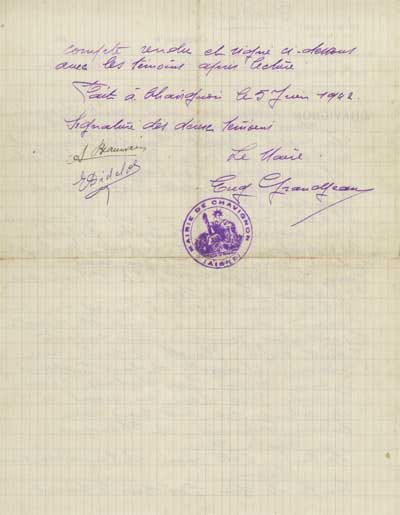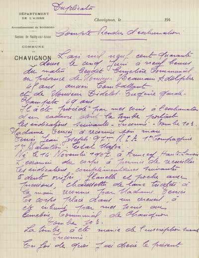 CHAVIGNON L'an mil neuf cent quarante deux le cinq Juin à neuf heures du matin lieudit Cimetière Communal en présence de Monsieur Beaurain Adolphe 45 ans ancien Combattant. et de Monsieur Didelot Eugène Garde- Champêtre 49 ans. Il à été procédé par mes soins à l'exhumation d'un cadavre dont la tombe portait les indications suivantes - Inconnu - Tombe 103. Madame Terrier à reconnu son mari Terrier Jean Joseph 97ème RIA 1er Compagnie 1er Bataillon . Etat Major . Né le 14 Novembre 1907 à Annecy Haute-Savoie. L'examen du corps à permis de recueillir les indications complémentaires suivantes 5 dents oréfiées ; flanelle et poche avec pressions, chaussettes de laine tricotées à la main reconnu par Madame Terrier Ce corps placé dans un cercueil, à été inhumé par mes soins au Cimetière Communal de Chavignon. Tombe 103. La tombe à été munie de l'inscription suivante Inconnu En foi de quoi j'ai ???? le présent compte rendu et signé ci-dessous avec les témoins après lecture. Fait à Chavignon le 5 juin 1942. Signature des deux témoins A Beaurain E Didelot Le Maire Eug Grandjean